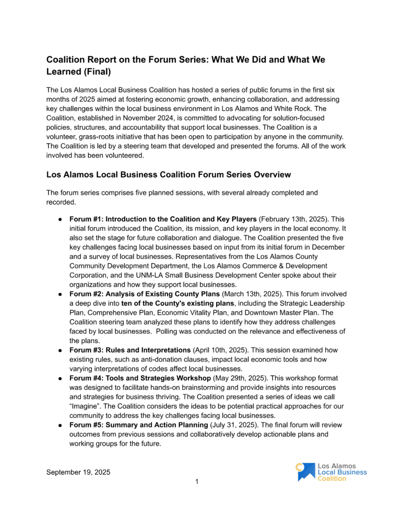 The Los Alamos Local Business Coalition will hold a series of five public forums aimed at fostering economic growth, enhancing collaboration, and addressing key challenges facing the local business environment in Los Alamos. These forums are designed to bring together community members, business owners, and key stakeholders to create actionable strategies for a thriving local economy.