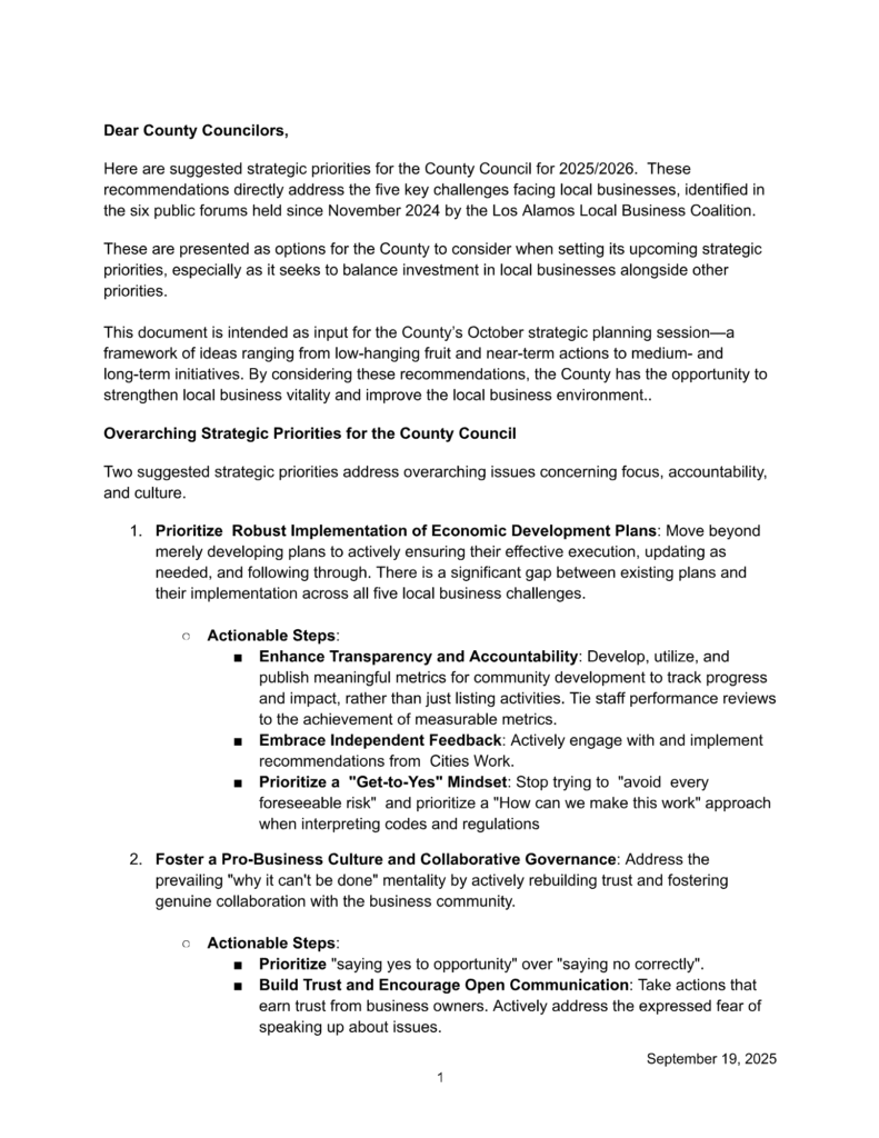 Explore our official articles, reports, and surveys that reflect the coalition’s positions and priorities. From letters to the County Council to published newspaper pieces, we address key issues affecting local businesses, share data-driven insights, and advocate for policies that promote a thriving business environment in Los Alamos.